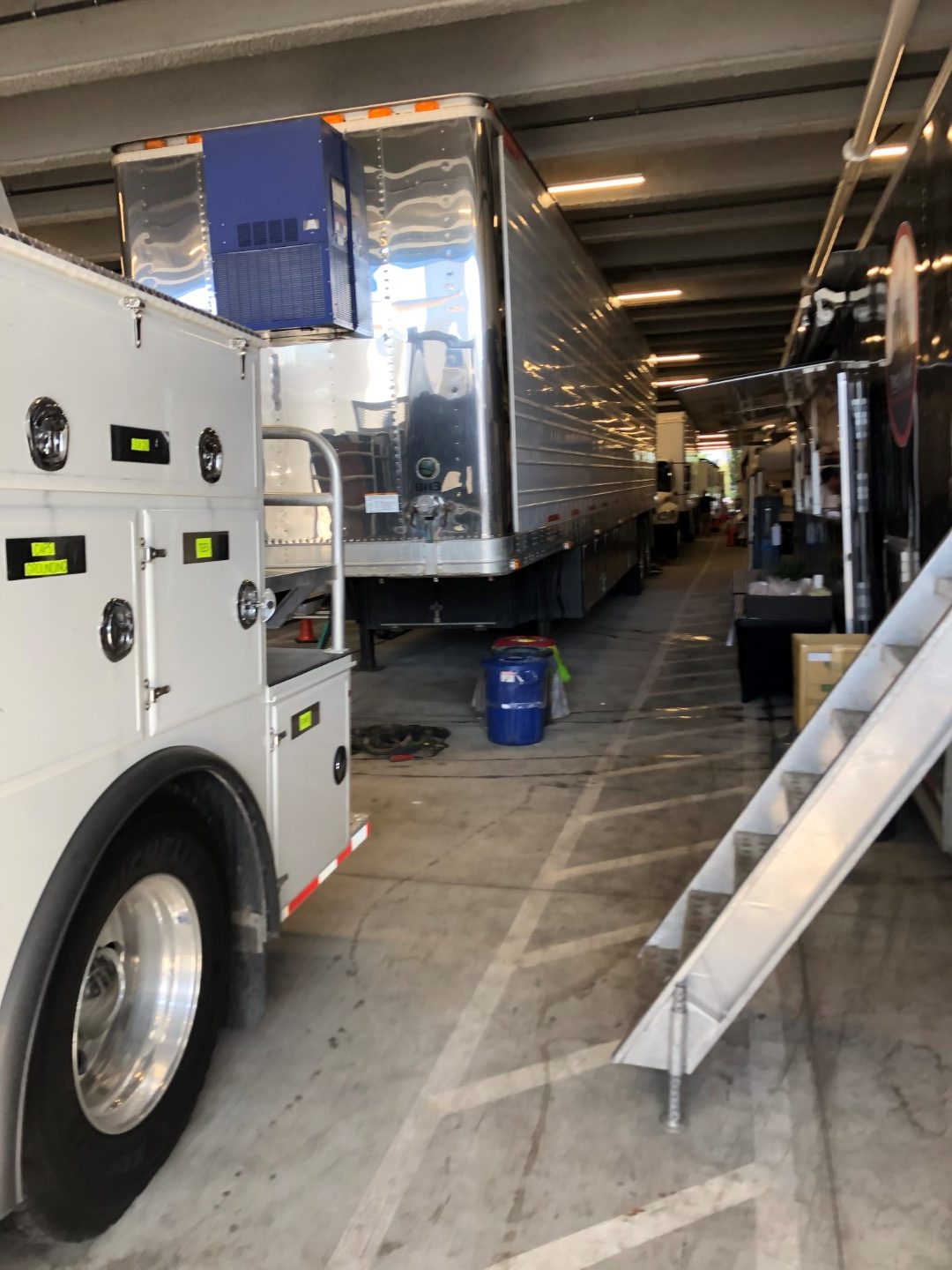 - 15 ft. high covered circus truck parking on level 1 with 2-400 amp camlocks